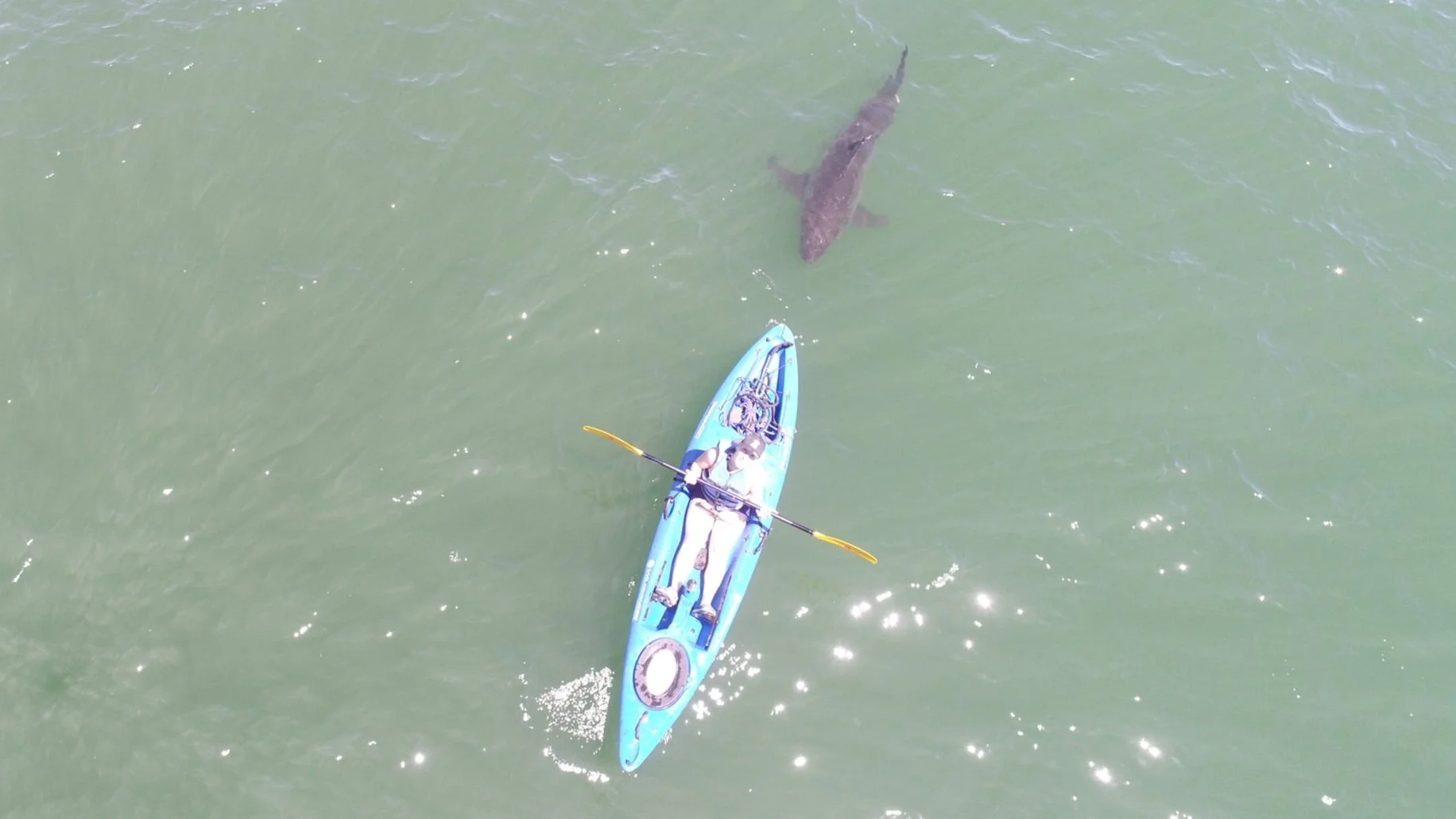 As we had planned, I paddled out from the beach while Giancarlo sent out his drone, and he notified me what he saw via radio. And sure enough, sharks eventually approached my kayak. I stopped paddling and stayed still. The experience was exhilarating, but I can’t say that I was scared, even to my own surprise. I was happy, laughing, smiling, and occasionally sharing some expletives of excitement with my friend over the radio.